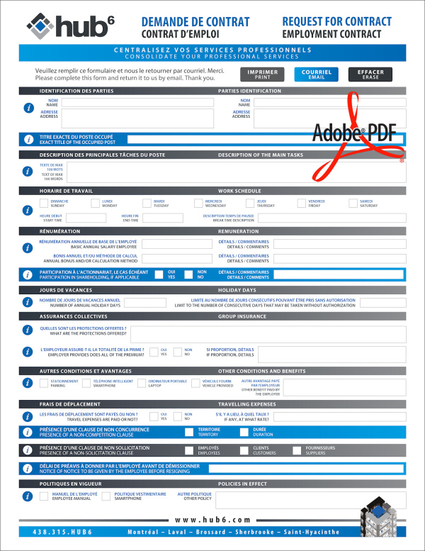 Particularité : Ce formulaire administratif est envoyé à la clientèle pour être remplie et renvoyé à l’entreprise. Habituellement, sans programmation poussée, le coût pour la programmation de ce type de formulaire PDF peut varier entre 195 $ à 295 $.